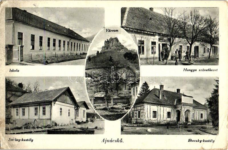 Beschreibung: Ajnácskő, Vár, iskola, Hangya, kastélyok / castle, school, shop (EB)