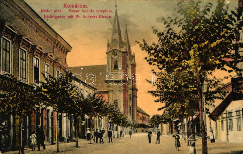 Komárom, Nádor utca, Szent András templom / street, church https://www.darabanth.com/de/236-Fernauktion/236.0/Ansichtskarten/Slowakei~35/Komarom-Nador-utca-Szent-Andras-templom-street-church~II1084222