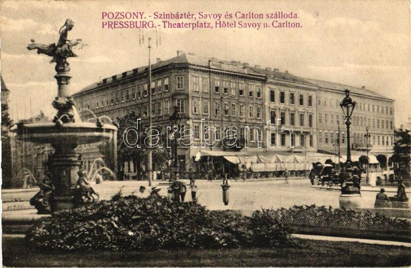 Pozsony, Színház tér, Savoy és Carlton szálloda / square, hotels https://www.darabanth.com/de/236-Fernauktion/236.0/Ansichtskarten/Slowakei~35/Pozsony-Szinhaz-ter-Savoy-es-Carlton-szalloda-square-hotels~II1081361