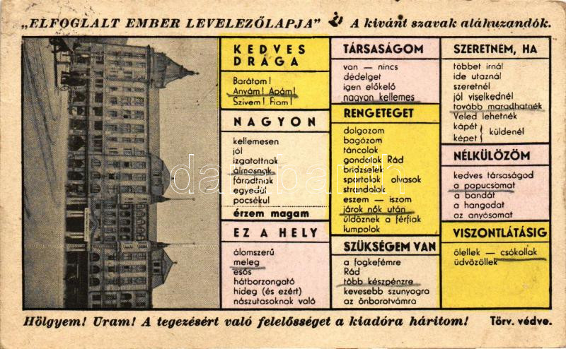 Beschreibung: Debrecen, Arany Bika szálloda, Elfoglalt ember levelezőlapja, humor
