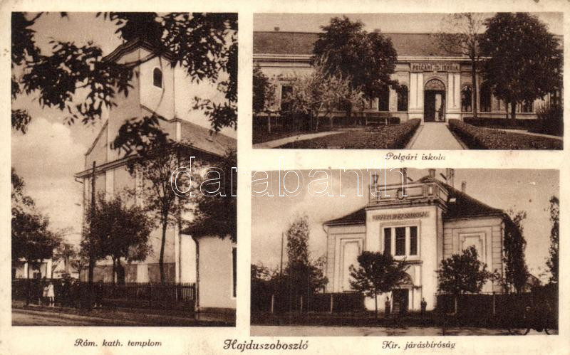 Beschreibung: Hajdúszoboszló, Római katolikus templom, Polgári iskola, Járásbíróság