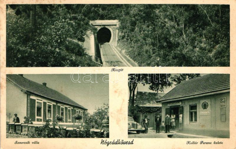 Beschreibung: Nógrádkövesd, Alagút, Szmrcsik villa, Kollár Ferenc üzlete, automobile, kiadja Kollár Ferenc