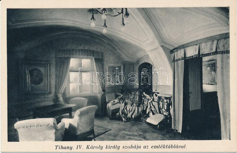 Tihany, IV. Károly király szobája az emléktáblával, belső https://www.darabanth.com/de/236-Fernauktion/236.0/Ansichtskarten/Ungarn~32/Tihany-IV-Karoly-kiraly-szobaja-az-emlektablaval-belso~II1086999