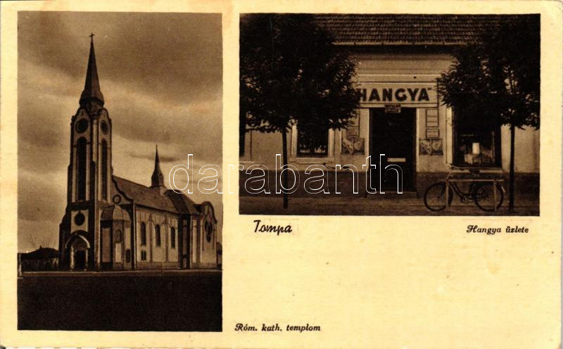 Beschreibung: Tompa, Katolikus templom, Hangya üzlet, kiadja Hangya szövetkezet
