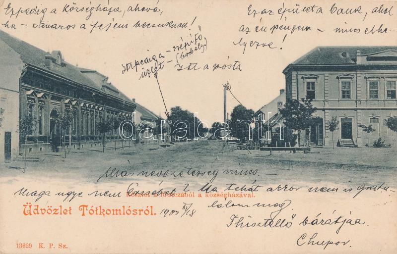 Beschreibung: Tótkomlós, Fő utca, községháza, bank, borbély üzlet, posta