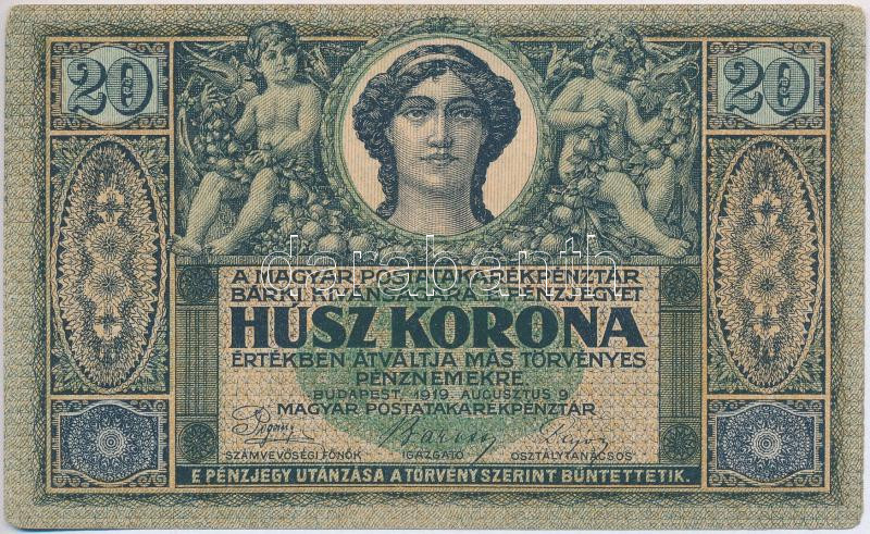 1919. Augusztus 9. 20K T:II- (hajtatlan) https://www.darabanth.com/de/236-Fernauktion/236.0/Numismatik/Ungarische-Banknoten~200007/1919-Augusztus-9-20K-TII-hajtatlan~II1082264