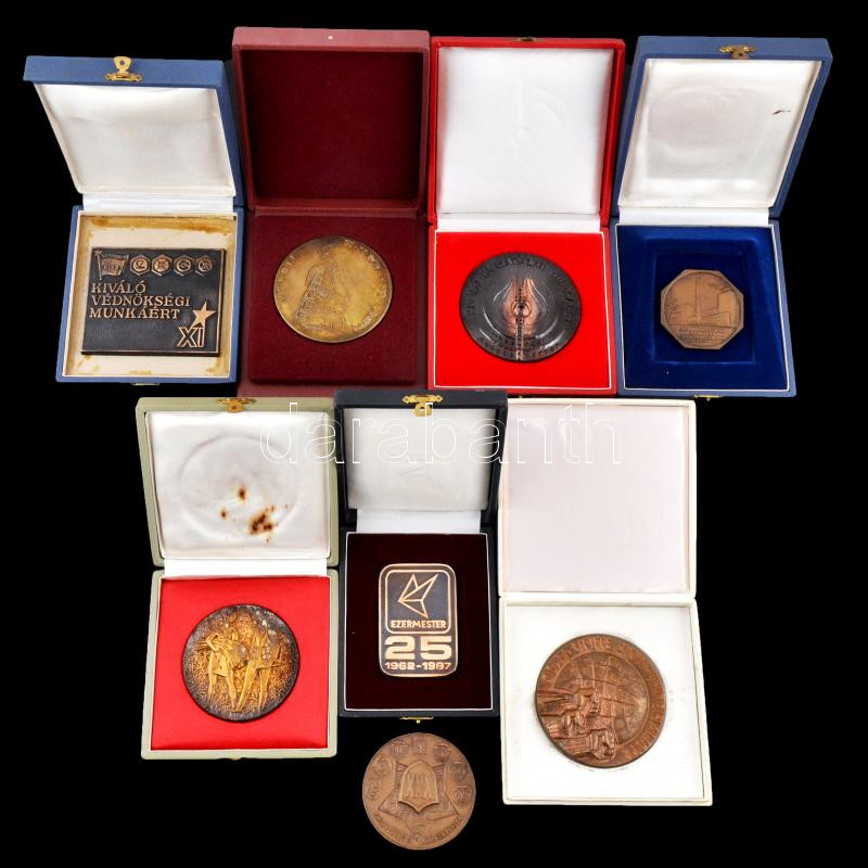 8db klf magyar és külföldi plakett főleg eredeti és nem hozzátartozó tokokkal a szocialista időszakból, közte 1979. "IV. E.F.O.T.T. Nyíregyháza" Br plakett, "Kiváló Társadalmi Munkáért" fém plakett (89mm) T:2