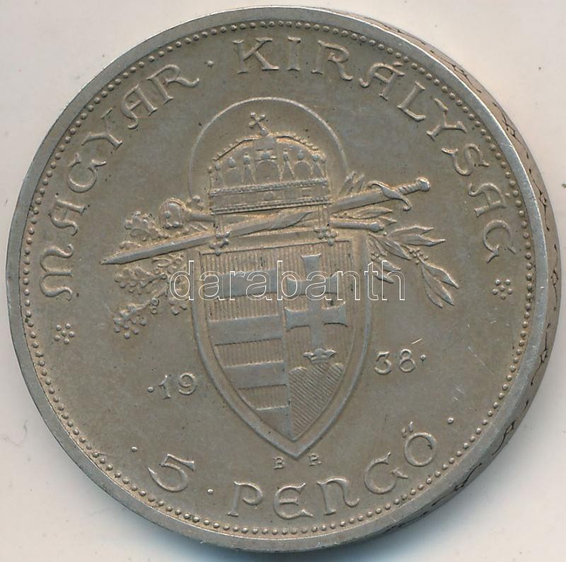 Adamo P8.1 https://www.darabanth.com/de/236-Fernauktion/236.0/Numismatik/Ungarische-Munzen~200008/1938-5P-Ag-Szent-Istvan-T2-patina-3Cbr3EAdamo-P81~II1083499