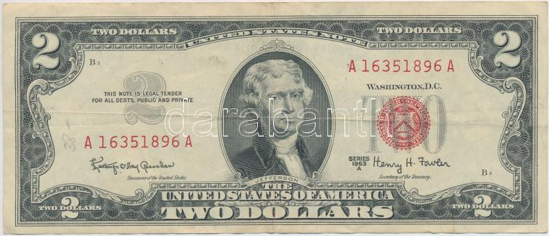 USA 1963. 2 D... https://www.darabanth.com/de/236-Fernauktion/236.0/Numismatik/Weltweit-Banknoten~200011/Amerikai-Egyesult-Allamok-1963-2USD-voros-pecsettel-TIII-3Cbr3EUSA-1963-2-Dollars-with-red-seal~II1088770