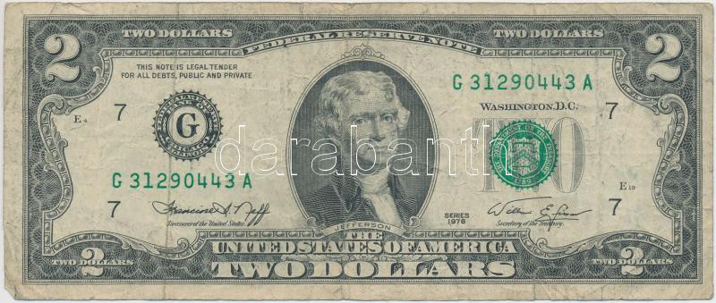 Amerikai Egyesült Államok 1976. 2$ zöld bankcímer és sorszám eltolódva T:III kis szakadás