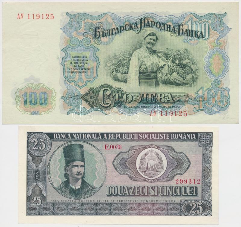 Bulgaria 1951. 100 Leva + Romania 1966. 25 Leva C:UNC,AU unfolded