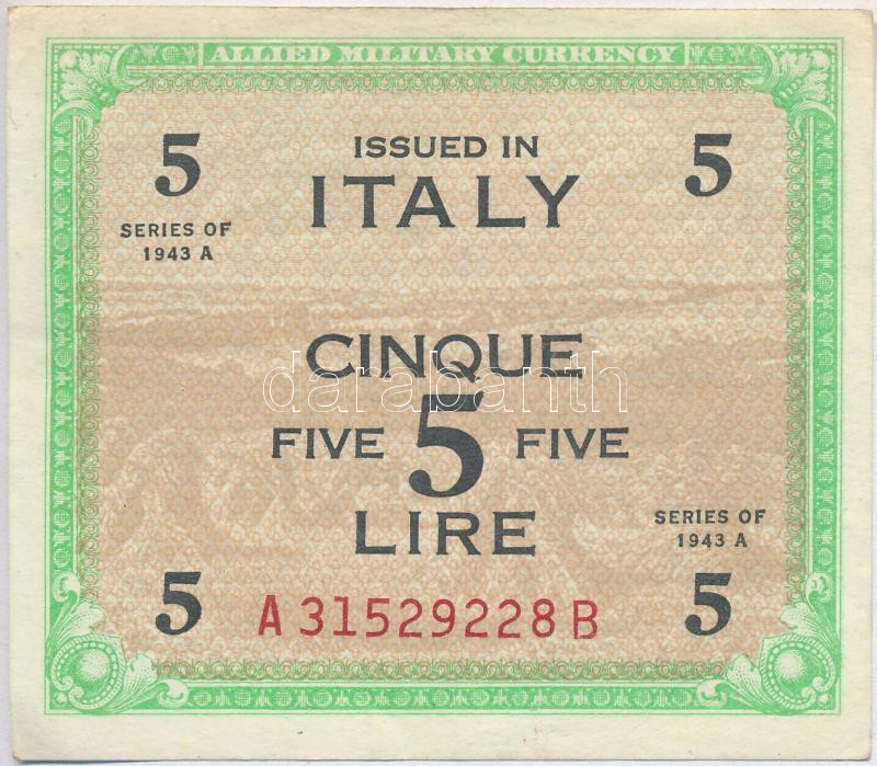 Italy/Allied Military... https://www.darabanth.com/de/236-Fernauktion/236.0/Numismatik/Weltweit-Banknoten~200011/Olaszorszagnemzetkozi-megszallas-1943-5L-TII--3Cbr3EItalyAllied-Military-Currency-1943-5-Lir~II1084478