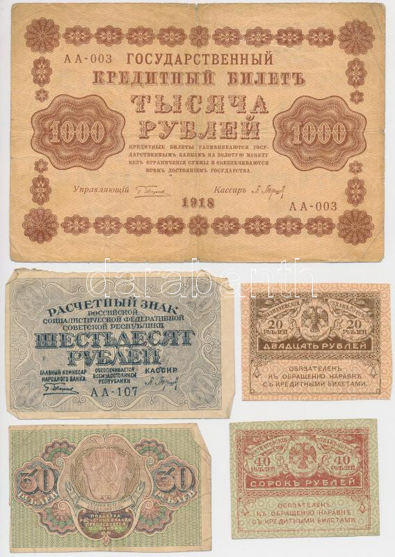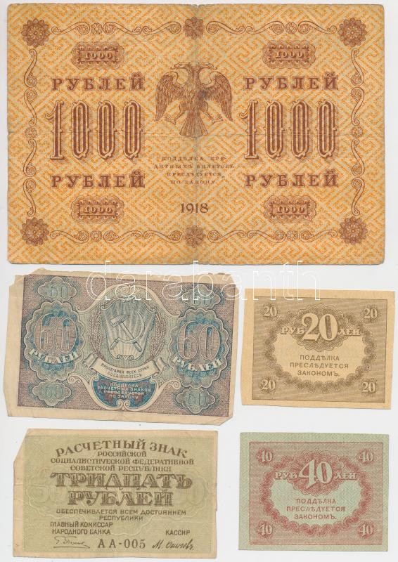 Beschreibung: Orosz Birodalom 1917. 20R + 40R + Szocialista Szövetségi Szovjet Köztársaság 1918. 1000R + 1919. 30R + 60R T:I-,III,III-