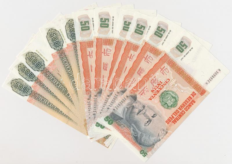 Peru 50 Intis (6x) including four sequential serials and two close serials + 500 Intis (5x) including two sequential serials and three close serials C:UNC,AU