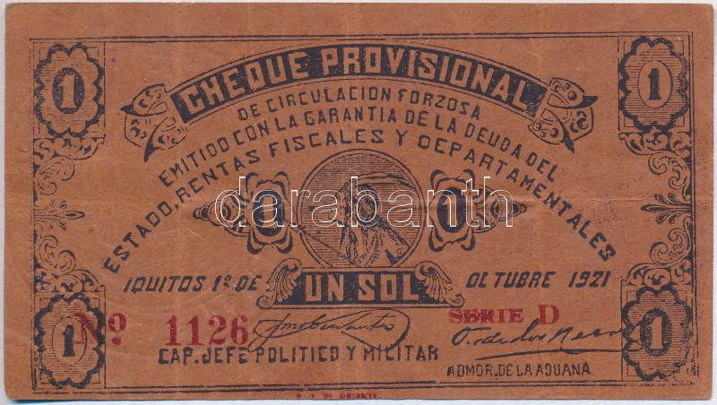 Peru / Iquitos 1921. 1 S... https://www.darabanth.com/de/236-Fernauktion/236.0/Numismatik/Weltweit-Banknoten~200011/Peru-Iquitos-1921-1S-felulbelyegzett-TIII-3Cbr3EPeru-Iquitos-1921-1-Sol-overprinted-CF~II1084567