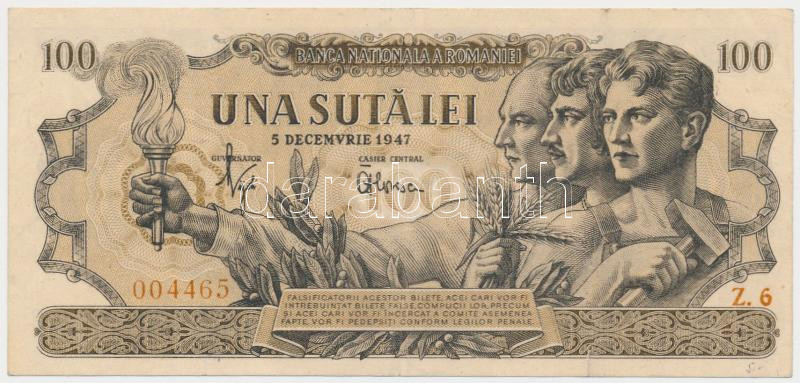 Romania 1947. 100 Lei C:F https://www.darabanth.com/de/236-Fernauktion/236.0/Numismatik/Weltweit-Banknoten~200011/Romania-1947-100L-TIII-3Cbr3ERomania-1947-100-Lei-CF~II1088976