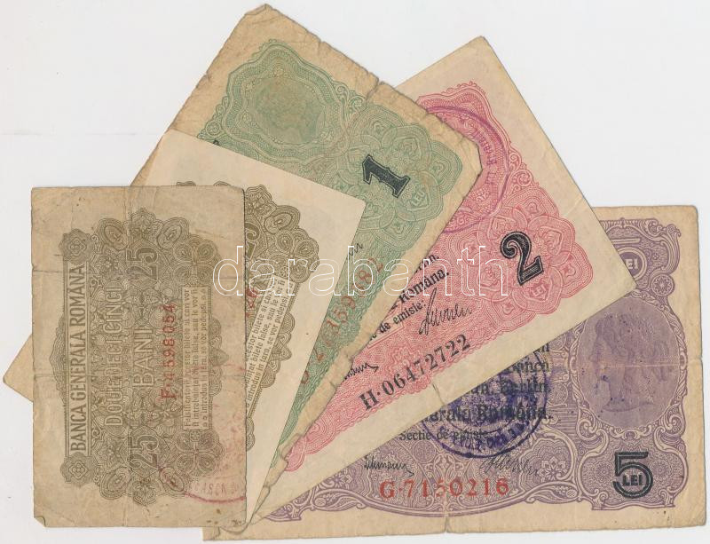 Romania / German occupation 1917. 25 Bani (2x) + 1 Leu + 2 Lei + 5 Lei all with Romanian overprint C:F,VG