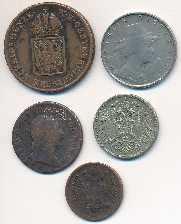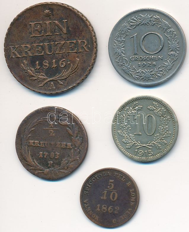 Ausztria 1783F 1/2kr Cu + 1816A 1kr Cu + 1915. 10h Cu-Ni-Zn + 1928. 10gr Cu-Ni + Olasz Államok / Lombardia-Velence 1862A 5/10S Cu T:vegyes