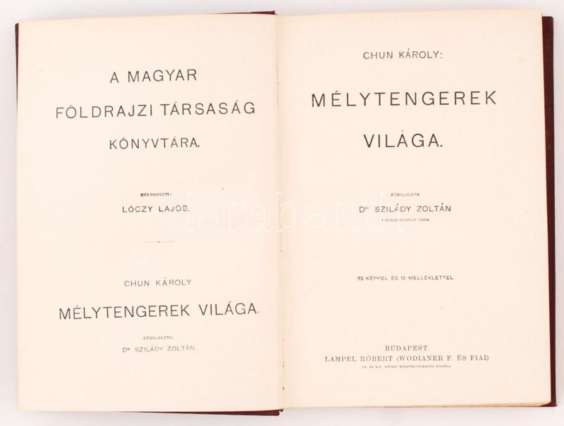 Magyar Földrajzi Társaság Könyvtára: Chun Károly: Mélytengerek világa. 73 képpel és 15 melléklettel, egy térképpel. Bp., [1902], Lampel R. Szép állapotban!