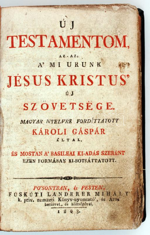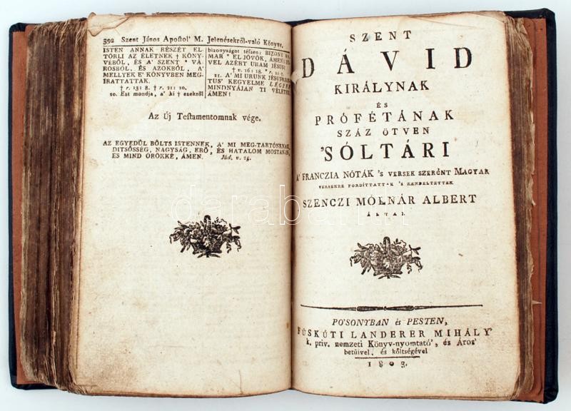 2 vallási témájú könyv egybekötve: Ú testamentum az az a' mi urunk Jésus Kristus új szövetsége magyar nyelvre fordítatott Károli Gáspár által. Posonban és Pesten, 1803, Füskúti Landerer Mihály. Szent Dávid királynak és prófétának száz ötven 'Sóltári... Po'sonyban és Pesten, 1803, Füskúti Landerer Mihály. Modern egészbőr kötésben.