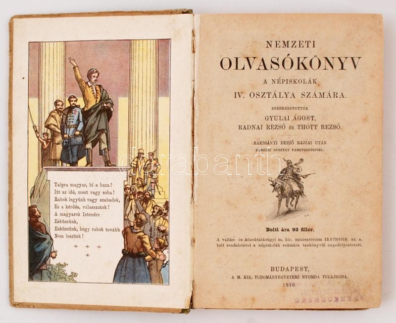 Gyulai Ágost, et alii (szerk.): Nemzeti olvasókönyv a népiskolák IV. osztálya számára. Budapest, 1910, A M. Kir. Tudományegyetemi Nyomda. Kopottas, kiadói karton kötésben.