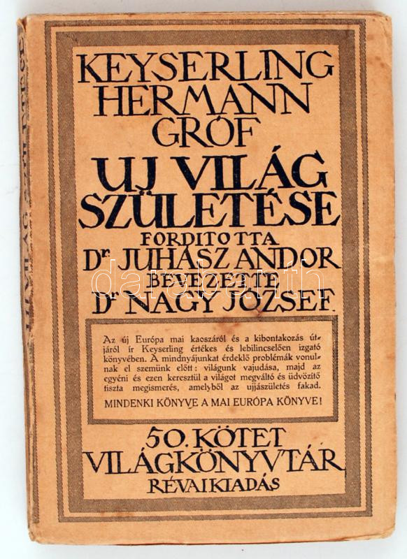 Keyserling Hermann gróf: Uj világ születése. Fordította: dr. Juhász Andor. Bevezette: dr. Nagy József. 50. kötet. Világkönyvtár. (Budapest), 1926, Révai Kiadás. Kiadói papír kötésben.