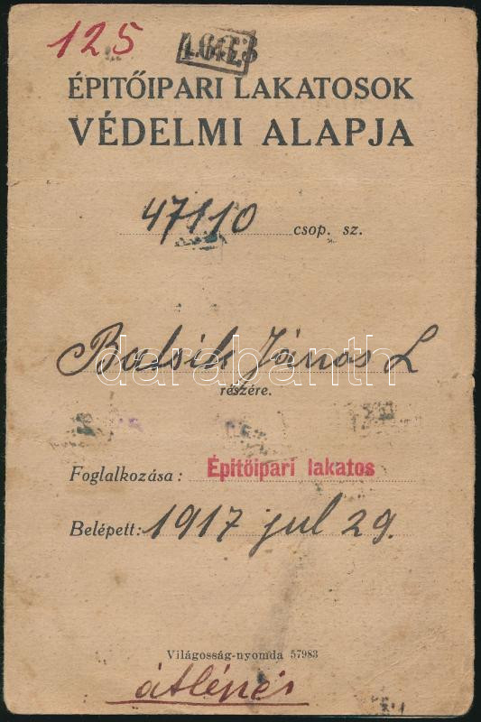 1920-1921 Az Építőipari Lakatosok Védelmi Alapja által kiadott tagsági... https://www.darabanth.com/de/237-Fernauktion/237.0/Andere-Sammelgebiete/Dokument~200019/1920-1921-Az-Epitoipari-Lakatosok-Vedelmi-Alapja-altal-kiadott-tagsagi-konyv-benne-sok-tagdi~II1094435