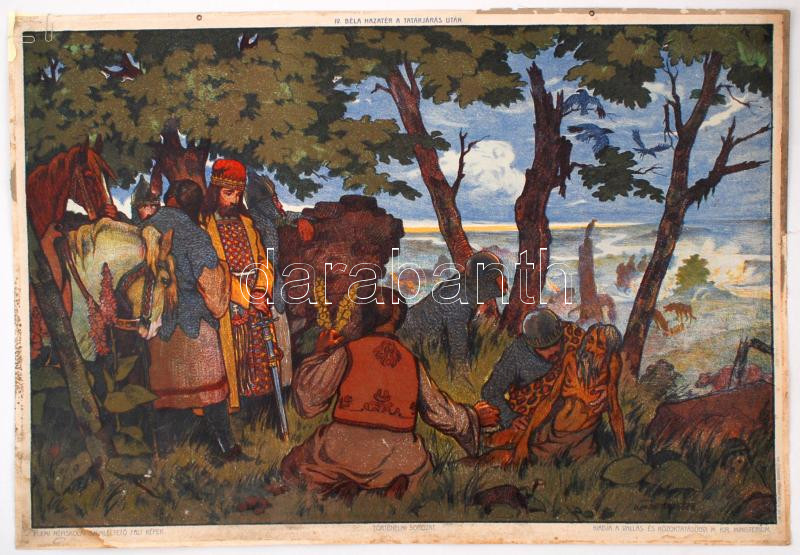 1914 IV. Béla hazatér a tatárjárás után, Szegedi-Kovács Ágoston (1888-1978) festménye után készített nagyméretű litho, az "Elemi népiskolai szemléltető fali képek" sorozatból, Bp., 1914, Vallási és Közoktatási M. Kir. Minisztérium, 57,5×86,5 cm