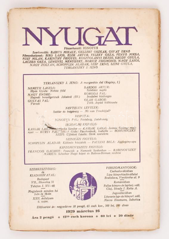 1929 A Nyugat című folyóirat XXII. évfolyamának 6. száma, benne Tersán... https://www.darabanth.com/de/237-Fernauktion/237.0/Andere-Sammelgebiete/Drucksachen~200037/1929-A-Nyugat-cimu-folyoirat-XXII-evfolyamanak-6-szama-benne-Tersanszky-Jeno-Ignotus-NC3~II1048114