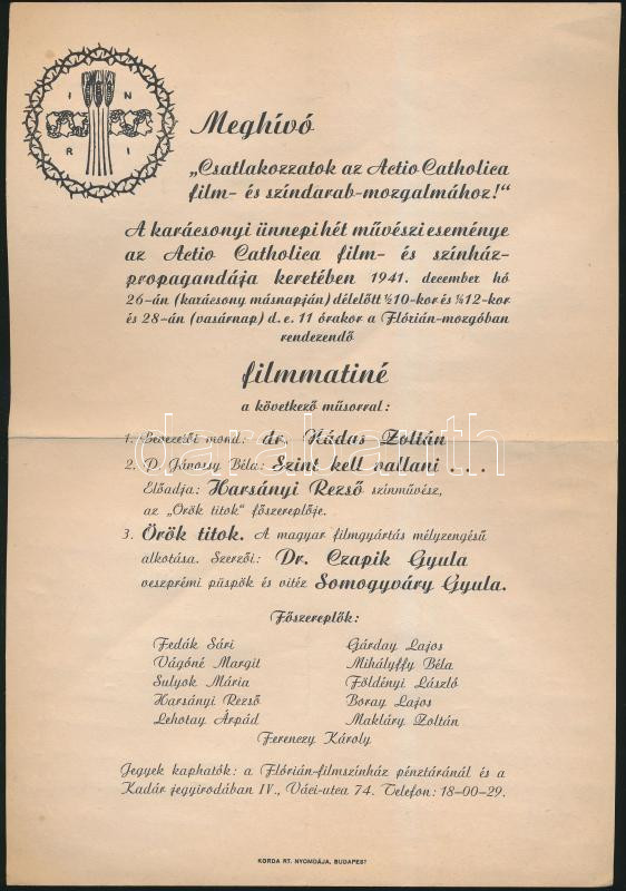Beschreibung: 1941 Meghívó az Actio Catholica film- és színház propagandája keretében rendezett filmmatinéra, rajta a műsor ismertetésével
