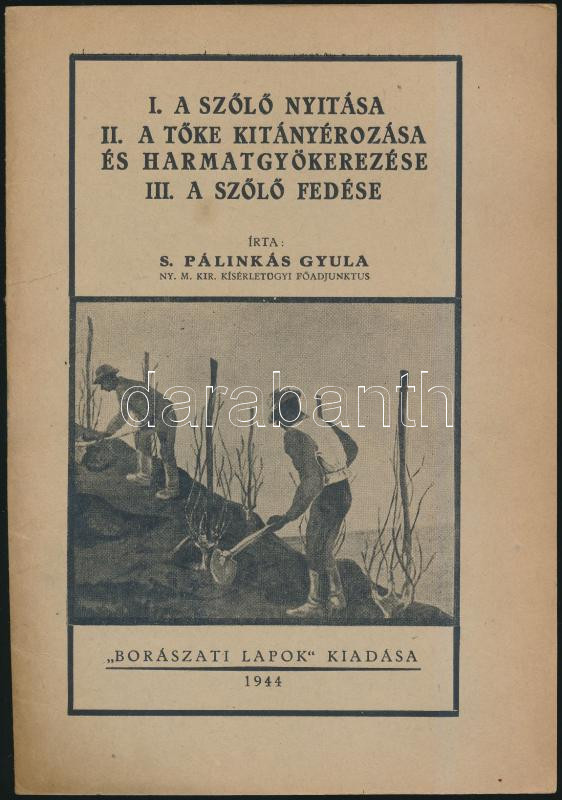1944 S. Pálinkás Gyula: I. A szőlő nyitása, II. A tőke kitányérozása é... https://www.darabanth.com/de/237-Fernauktion/237.0/Andere-Sammelgebiete/Drucksachen~200037/1944-S-Palinkas-Gyula-I-A-szolo-nyitasa-II-A-toke-kitanyerozasa-es-harmatgyokerezes~II1094102