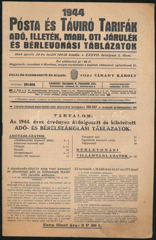 Beschreibung: 1944 posta és Távíró Tarifák, adó, illeték, MABI, OTI járulék és bérelvonási táblázatok, XXXVII. évfolyam 2. füzet, 16p