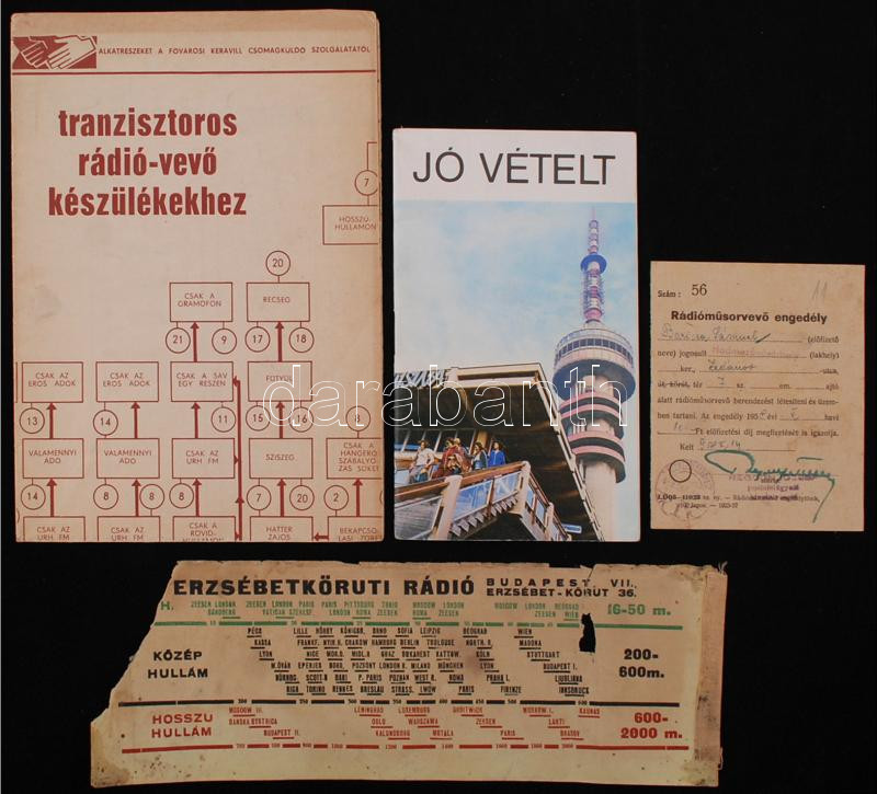 1958 Az Ezermester hibakereső táblázata tranzisztoros rádió-vevő készülékekhez, alkatrészek a Fővárosi Keravill Csomagküldő Szolgálattól, rádióműsorvevő engedély, "Jó vételt" - A Magyar Posta által kiadott tájékoztató