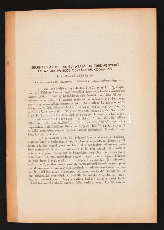 cca 1938 Mottl Mária dr.: Jelentés az 1936/38. évi ásatások eredményéről és az ősgerinces osztály működéséről. 24 db szövegközi fényképábrával, 1 táblázattal és számos barlangtérképpel.