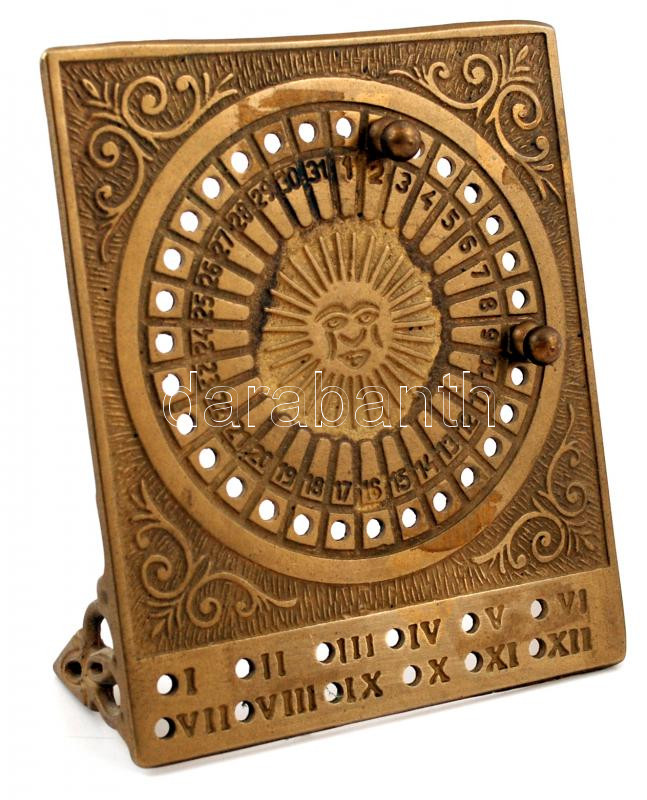 Dekoratív réz asztali öröknaptár, jelölő pöckökkel, m: 13 cm https://www.darabanth.com/de/237-Fernauktion/237.0/Andere-Sammelgebiete/Flohmarkt~200048/Dekorativ-rez-asztali-oroknaptar-jelolo-pockokkel-m-13-cm~II1093720