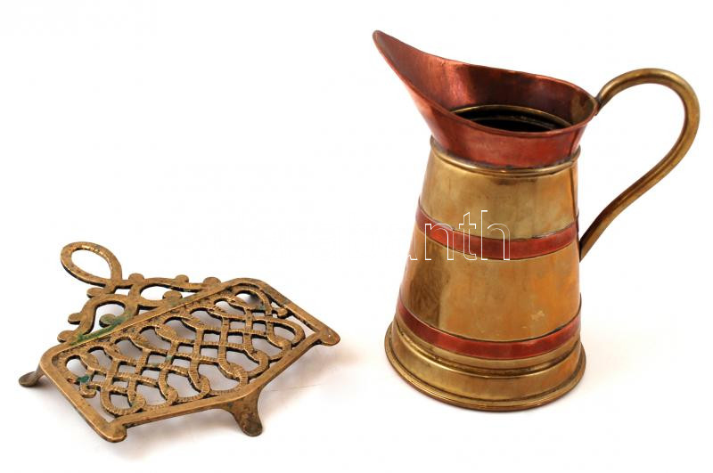 Beschreibung: Díszes réz kiöntő(m: 17 cm) + gazdagon díszített réz edényalátét(18x13 cm)