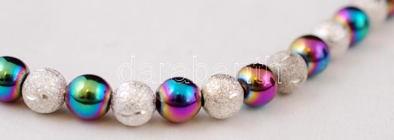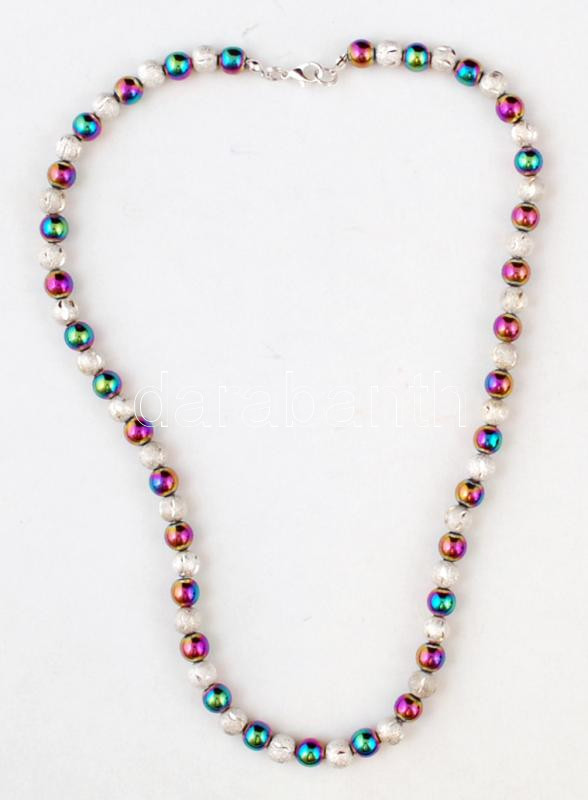 Beschreibung: Szivárvány- és ezüst színű gyöngyökből készült dekoratív gyöngysor, h: 50 cm, szép tokban