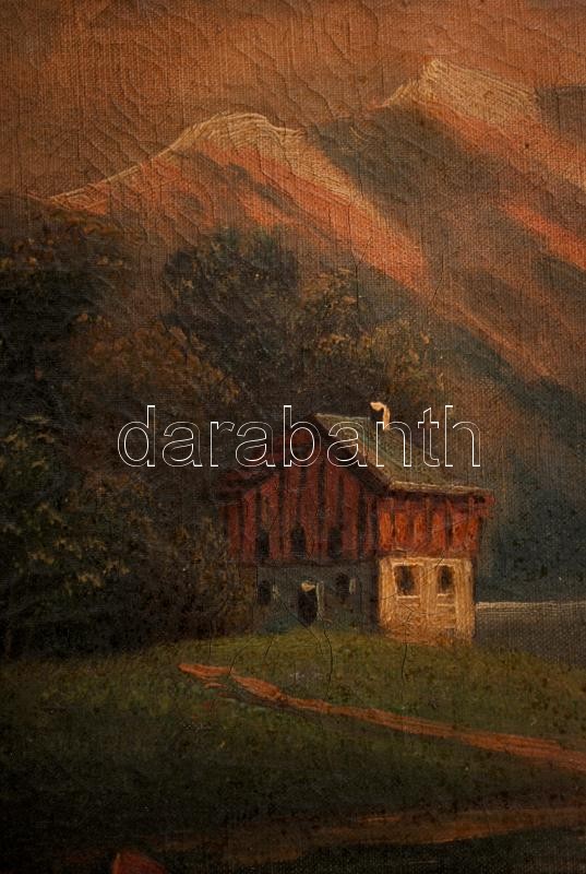 Beschreibung: Molnár jelzéssel: Alpesi táj. Olaj, vászon, szakadással, antik sérült keretben 49×66 cm