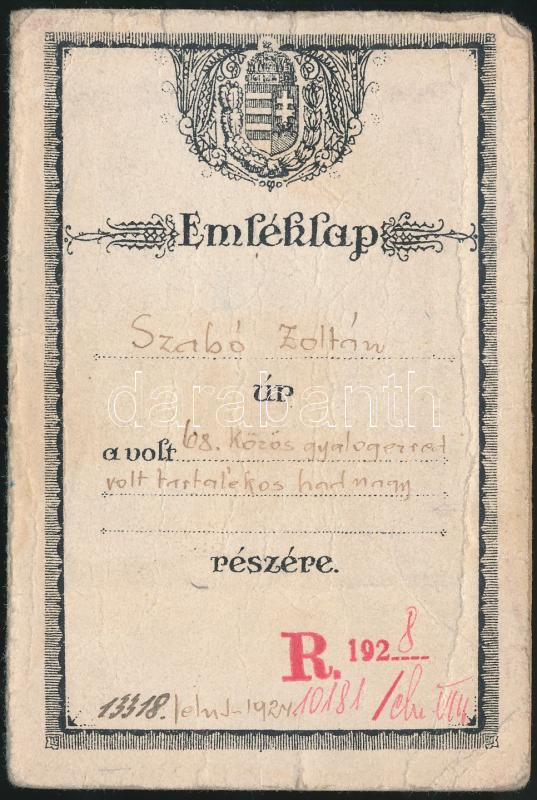 1924 Emléklap a 68. közös gyalogezred volt tartalékos hadnagya részére... https://www.darabanth.com/de/237-Fernauktion/237.0/Andere-Sammelgebiete/Militaria~200033/1924-Emleklap-a-68-kozos-gyalogezred-volt-tartalekos-hadnagya-reszere-a-szolgalat-idejen-sz~II1093761
