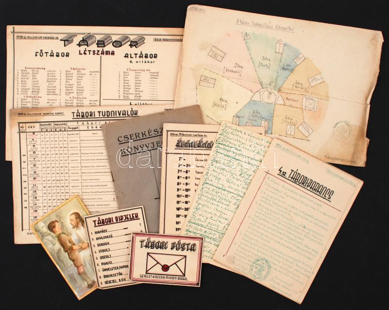 cca 1930-1947 Érdekes cserkész tétel: különféle, a tábori élettel kapcsolatos dokumentumok, nagyrészt a 856. sz. Millennium cserkészcsapat életéből: általános napirend, tábori parancsok (4-12. sz., a 4. sz. parancs fogalmazványával!), Tábori tudnivalók (Szerk.: Sztrilich Pál. Bp., 1937.), a takarítási körzetek kézzel rajzolt térképe stb.