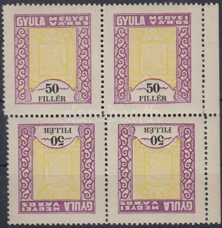 1939 Gyula 50f négyestömb két fordított párral városi okmánybélyeg, fü... https://www.darabanth.com/de/237-Fernauktion/237.0/Andere-Sammelgebiete/Stempelmarken~200015/1939-Gyula-50f-negyestomb-ket-forditott-parral-varosi-okmanybelyeg-fuggoleges-fogazas-le~II1089370