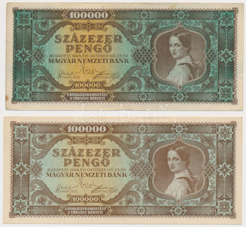 1945. 100.000P 2xklf színváltozat! T:I-,III https://www.darabanth.com/de/237-Fernauktion/237.0/Numismatik/Ungarische-Banknoten~7/1945-100000P-2xklf-szinvaltozat-TI-III~II1093390