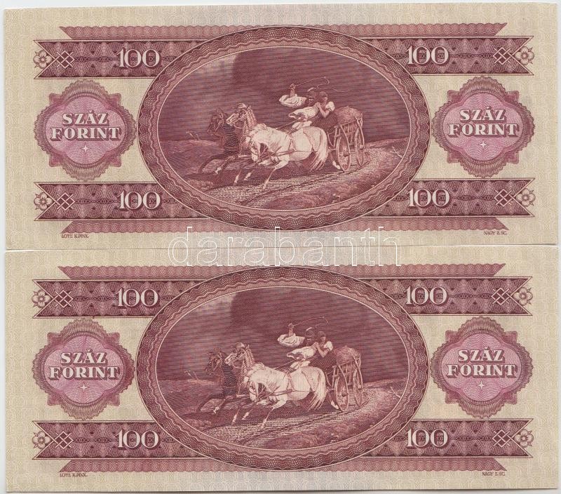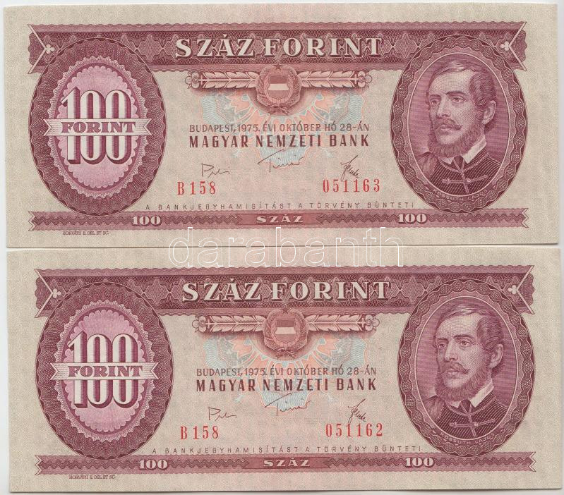 1975. 100Ft (2x) sorszámkövetők T:I,I- https://www.darabanth.com/de/237-Fernauktion/237.0/Numismatik/Ungarische-Banknoten~7/1975-100Ft-2x-sorszamkovetok-TI-I-~II1081138