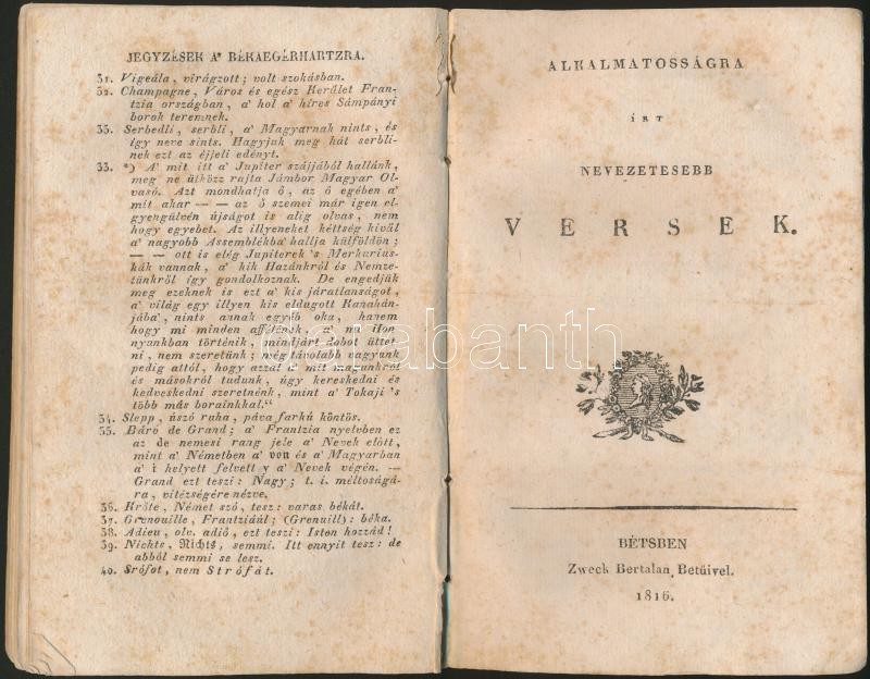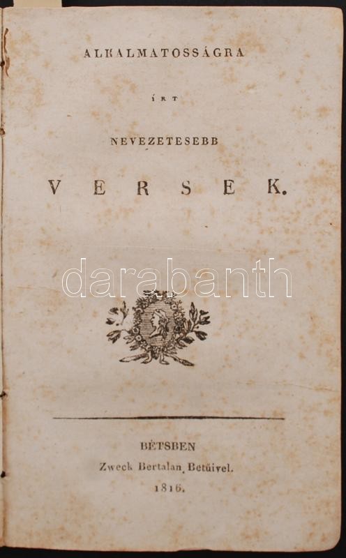 Bétsben, 1816, Pichler Antal Betűivel, 1816. A kiadói papír borító teljesen hiányzik, fénymásolattal pótolva.