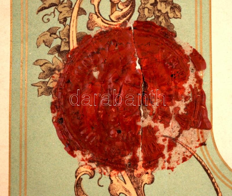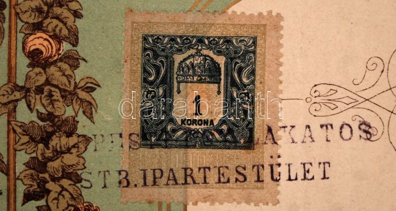 1907 Bp., A budapesti egyesült lakatos-, puskaműves-, reszelővágó-, késes-, lánckovács-, sarkantyús-, csatos-, szerkovács-, kardműves ipartestület által kiállított díszes bizonyítvány és testületi oklevél töredezett viaszpecséttel, okmánybélyeggel, széle helyenként szakadozott