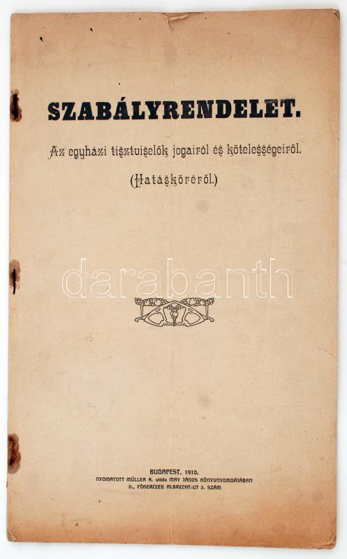 1910 Bp., Szabályrendelet az egyházi tisztviselők jogairól és köteless... https://www.darabanth.com/de/238-Fernauktion/238.0/Andere-Sammelgebiete/Drucksachen~600004/1910-Bp-Szabalyrendelet-az-egyhazi-tisztviselok-jogairol-es-kotelessegeirolhataskorerC5~II1024556