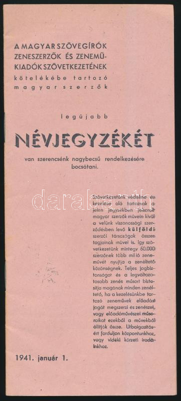 1941 A Magyar Szövegírók Zeneszerzők és Zeneműkiadók Szövetkezetének k... https://www.darabanth.com/de/238-Fernauktion/238.0/Andere-Sammelgebiete/Drucksachen~600004/1941-A-Magyar-Szovegirok-Zeneszerzok-es-Zenemukiadok-Szovetkezetenek-kotelekebe-tartozo~II1100834