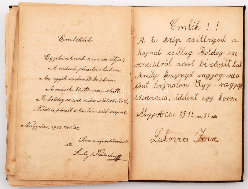 1911-15 Emlékkönyv tele kedves versekkel, jókívánságokkal, 18x12cm https://www.darabanth.com/de/238-Fernauktion/238.0/Andere-Sammelgebiete/Flohmarkt~600022/1911-15-Emlekkonyv-tele-kedves-versekkel-jokivansagokkal-18x12cm~II1105260