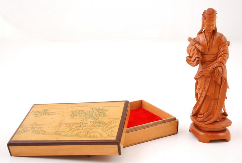 Beschreibung: Fa doboz, keleti életképes fedéllel, 16×11×4,5 cm + Keleti motívumos fából készült, díszesen faragott szobor, jelzés nélkül, m: 21 cm