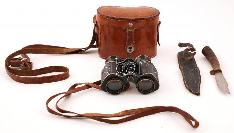 Beschreibung: Távcső, saját bőr tokjában + agancsnyelű vadászkés, saját műbőr tokjában